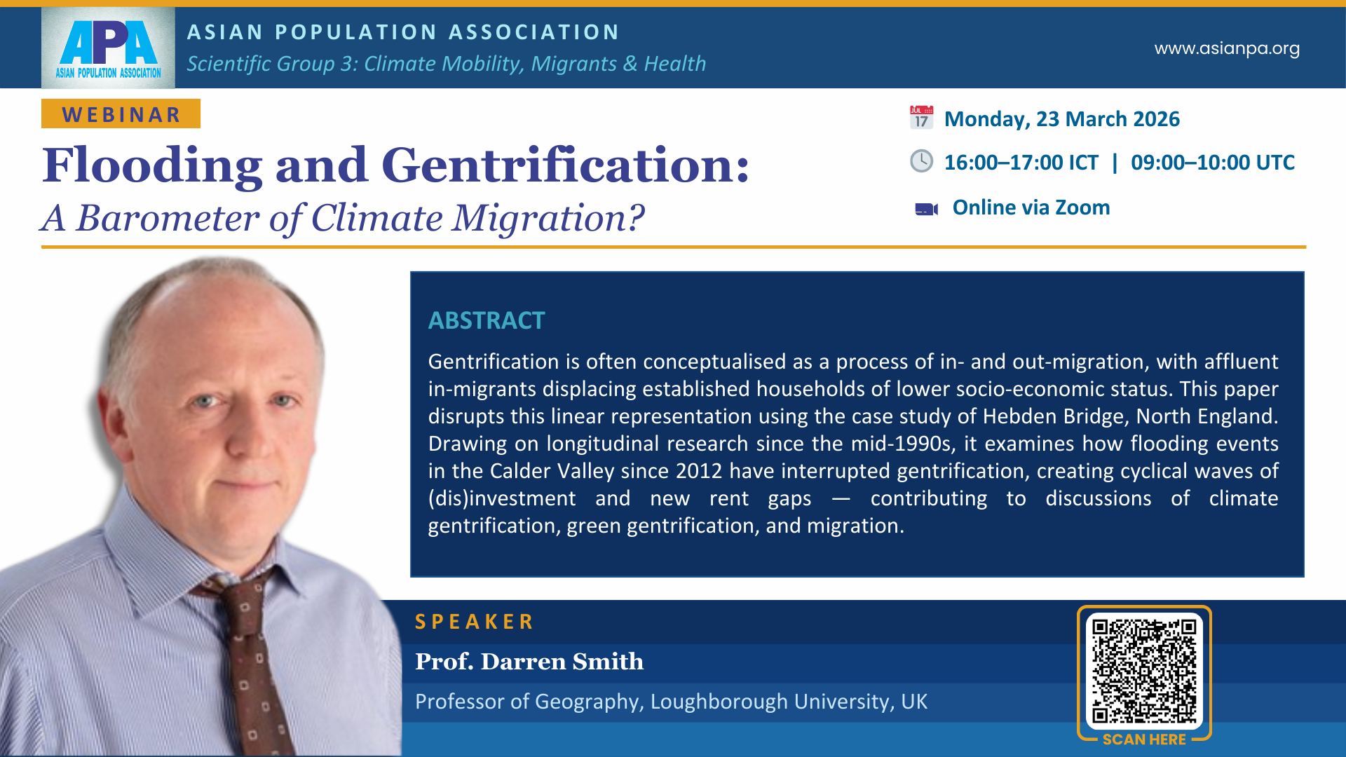 In this seminar, Prof. Smith will discuss how repeated flooding events in the Calder Valley (North England) have influenced patterns of investment, displacement, and migration. Drawing on longitudinal research since the mid-1990s, the talk explores how climate risks may disrupt or reshape gentrification processes and contribute to debates on climate migration.
